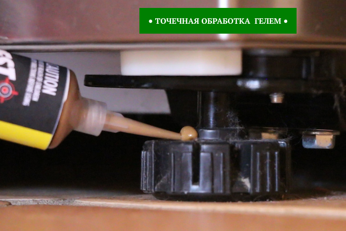 Дезинсекция в стоматологическом центре от тараканов гелем не имеет запаха, наносятся с помощью пистолета-дозатора или из носика тубы каплями в местах их передвижения и основного заражения насекомыми. Под раковинами, за холодильником, около мусорных баков, стояки водоснабжения, в трещины, в щели и другие места укрытия тараканов. Наносится гель точечно или пунктирной линией, в зависимости от численности вредителей. Возможно наносить на подложки из плотной бумаги и расставлять в местах заражения и передвижения прусаков.