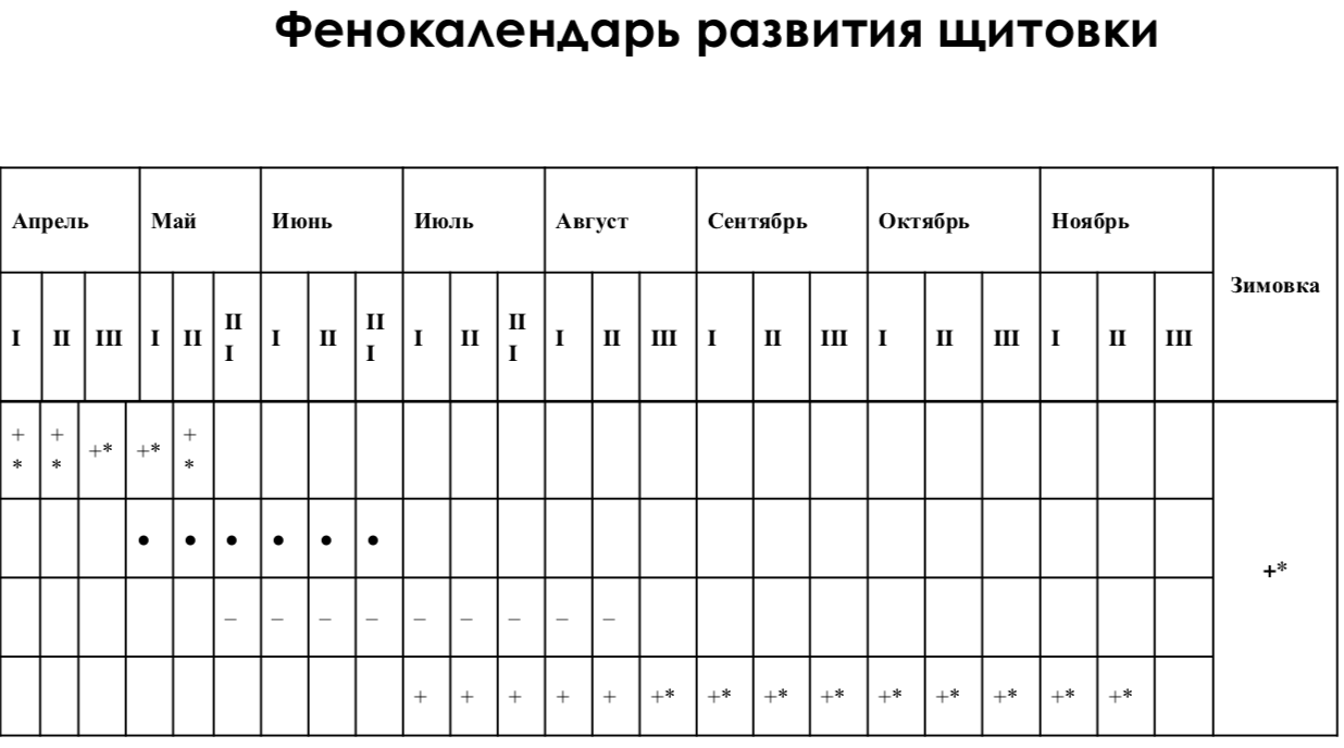 Календарь обработок от ложнощитовкиУниверсального "календаря обработок от ложнощитовки" с конкретным названием, который был бы широко известен и стандартизирован, не существует. Причина в том, что время обработки зависит от температура и влажности, которые сильно влияют на активность ложнощитовки. Исходя из наблюдений предыдущих лет, обработка до первой декады мая (ориентировочно❗) — эффективная борьба с личинками второго возраста в весенний период. Вторую обработку рекомендуется проводить в течение 10-14 дней с момента массового появления личинок - бродяжек (❗ориетировочно с 20 июня). Вред от ложнощитовкиВредоносность большой еловой ложнощитовки заключается в высасывании самками и личинками сока побегов и хвои, в результате чего опадает хвоя, уменьшается годовой прирост побегов, происходит их искривление. Медование P. piceae способствует заселению елей комплексом сапрофитных грибов, вызывающих снижение транспирации и фотосинтеза.